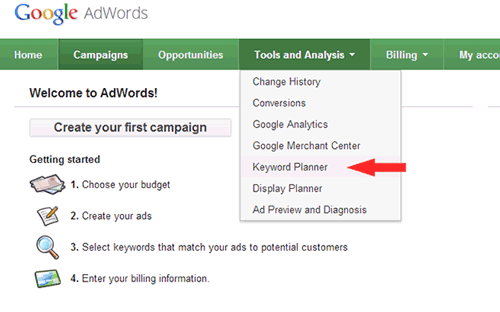 قبل از هرچیز شما باید یک اکانت Gmail داشته باشید تا از طریق آن به بخش Google Adwords دسترسی پیدا کنید. پس از ورود به صفحه ادوردز با محیطی مشابه تصویر زیر روبرو خواهید شد که جهت دسترسی به ابزار Keyword Planner از منوی بالا و بخش Tools & Analysis باید به صفحه مربوط به آن بروید.