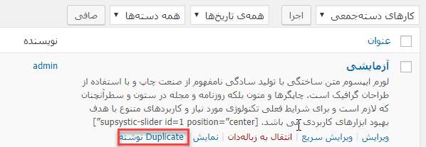 سپس به بخش نوشتهها برید و نوشتهای که قصد دارید از آن کپی بگیرید را انتخاب کنید! بعد روی لینک آبیرنگ “duplicate نوشته” کلیک کنید.
