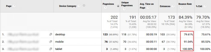 اگر مقدار Bounce Rate برای نسخه موبایل خیلی بیشتر از دسکتاپ باشد این مورد نشان میدهد کاربران سایت شما تمایلی به ماندن در آن صفحه ندارند.