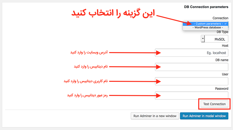 برای این کار کافیست در مرحله اول گزینه custom parameters را انتخاب کرده و در همان مرحله اطلاعات دیتابیس مورد نظر را وارد نمائید .