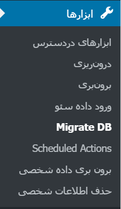 افزونه را از انتهای آموزش دریافت کنید، سپس آن را در مسیر افزونهها نصب و فعال سازید. پس از فعالسازی از منوی ابزارها>> Migrate DB را مشاهده میکنید: