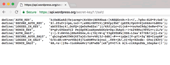 بعد از هز بار رفرش زدن صفحه یک کد جدید بوجود می آید که شما میتوانید یکی از آنها را به دلخواه کپی کرده و به جای تکه کدی که در wp-config.php شما نشان دادیم قرار دهید . حالا فایل خود را ذخیره کرده و ببندید .